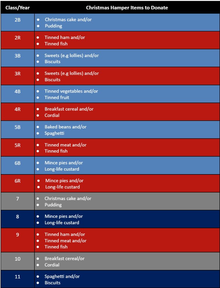 : Each class/year group has been allocated specific items to bring to school to contribute to our Christmas Hampers to ensure that hampers have a good range of items for those receiving them. These items are listed on the next page.